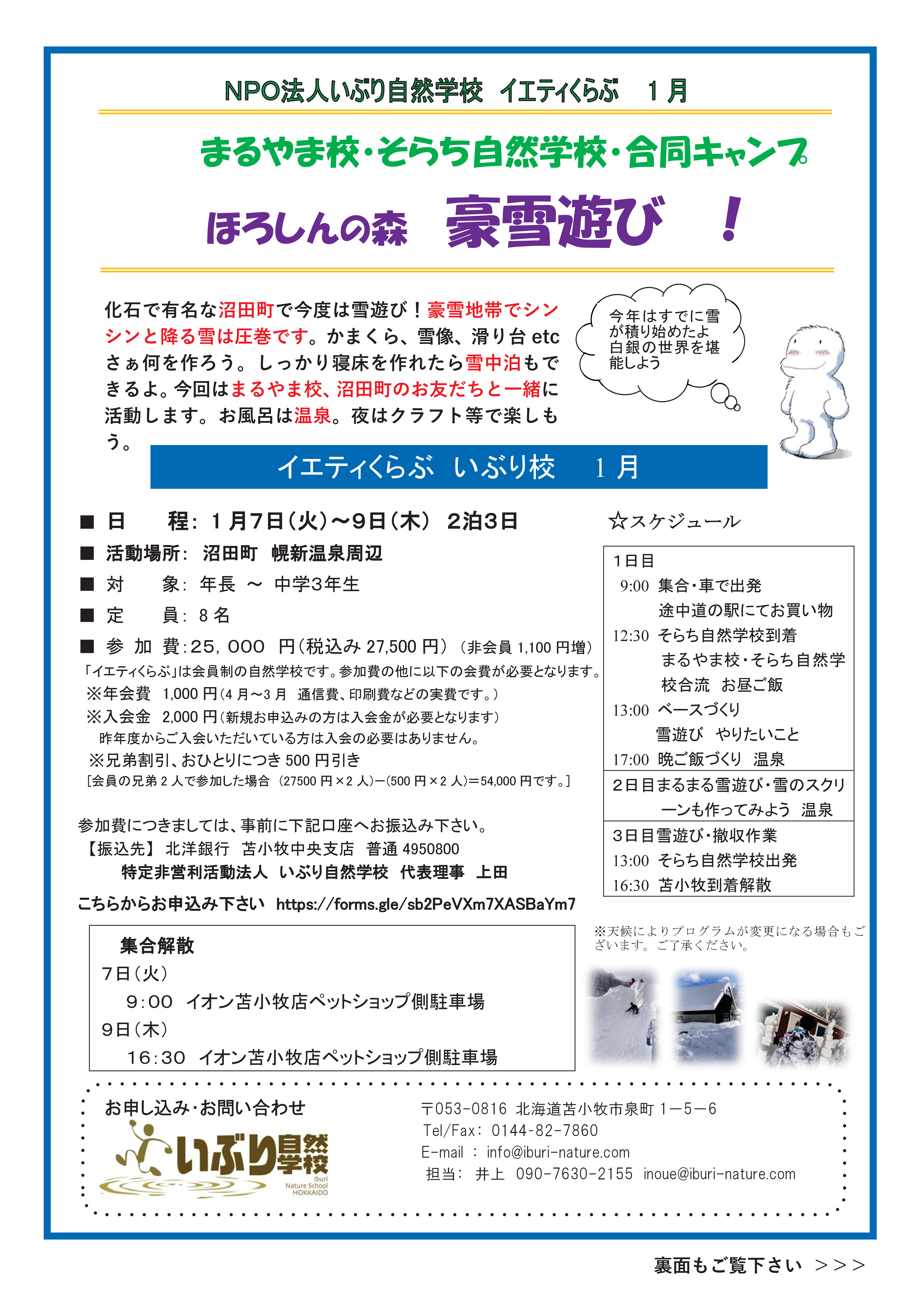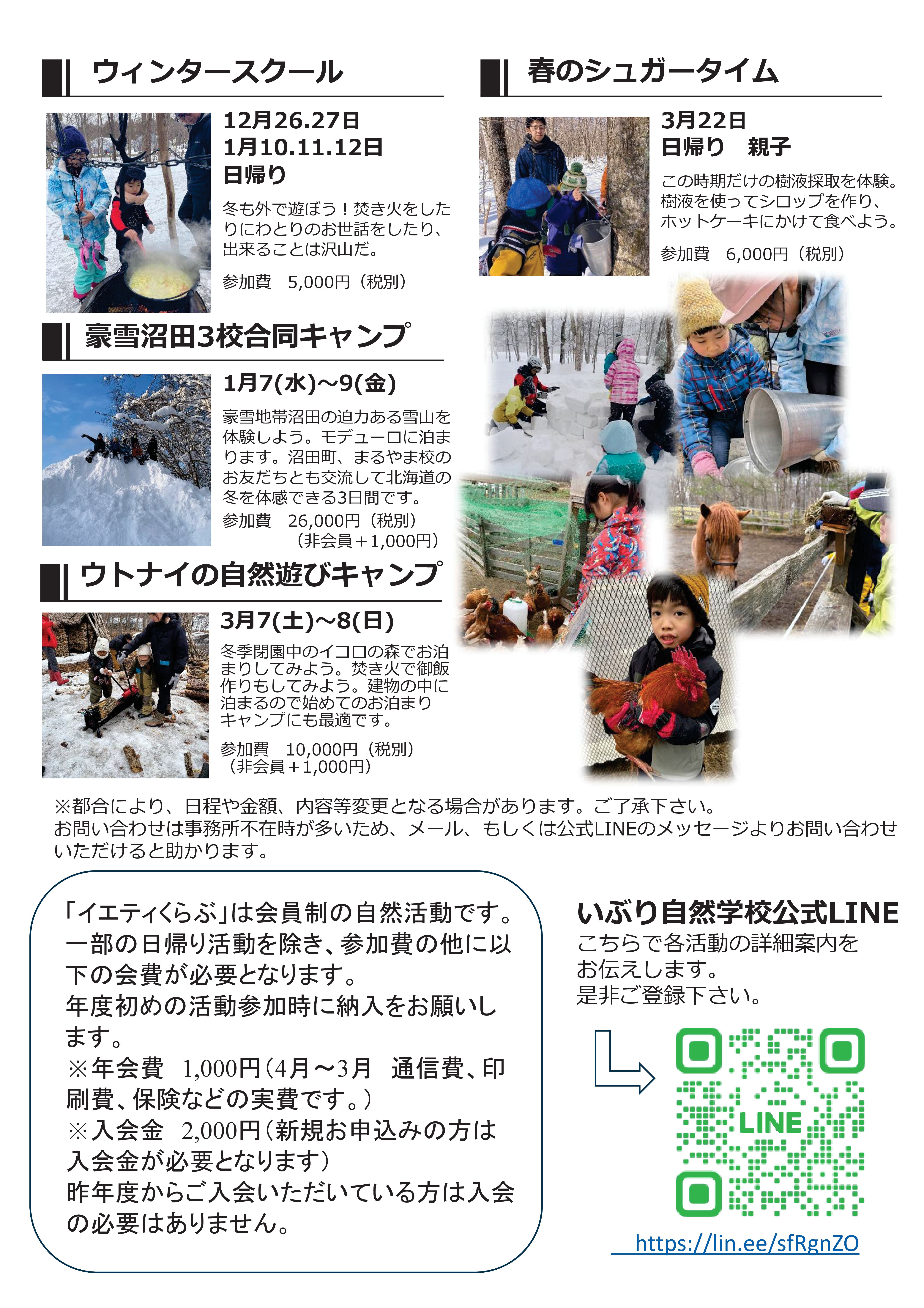 今回はまるやま校、沼田町のお友だちと一緒に活動します。お風呂は温泉。夜はクラフト等で楽しもう。